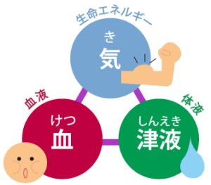 東洋医学ではそれに「氣」の概念を合わせて「氣」「血」「津液(しんえき:血液以外の水分)」と分類しています。